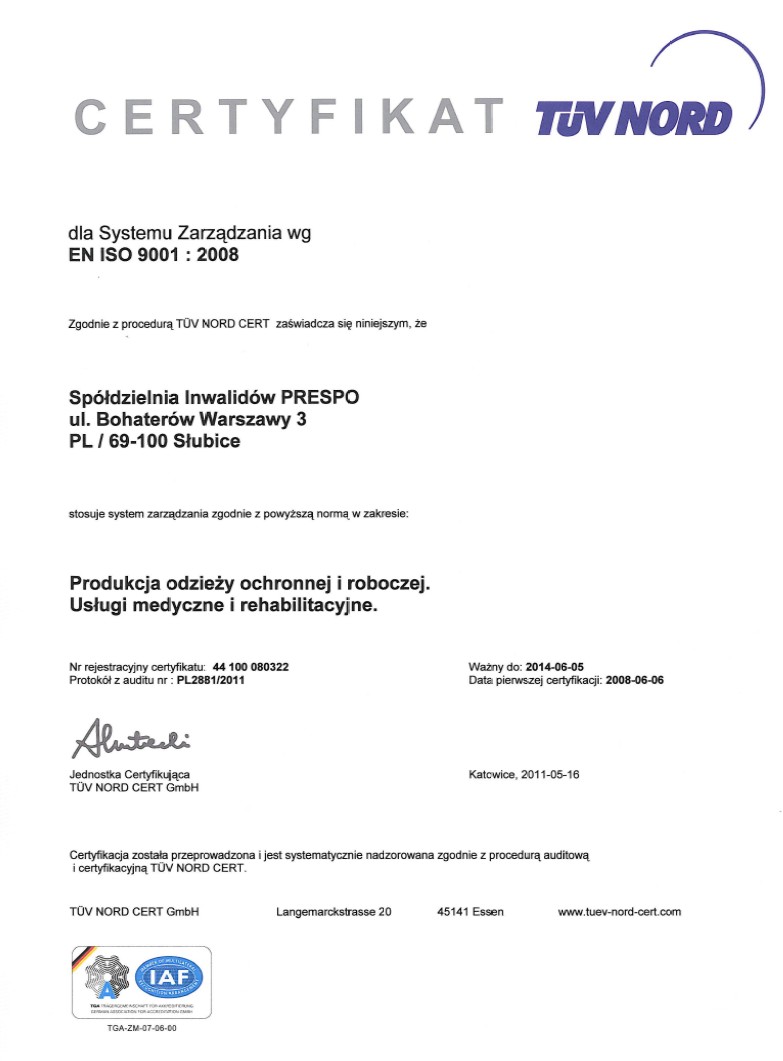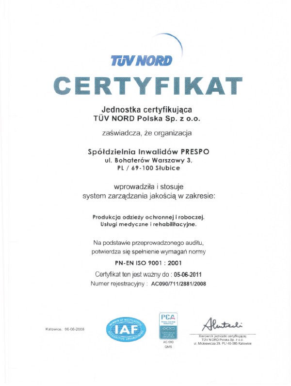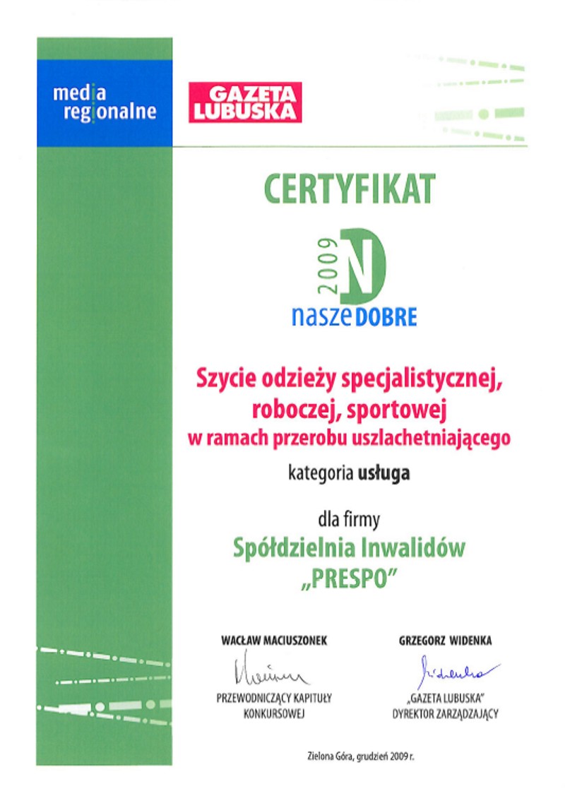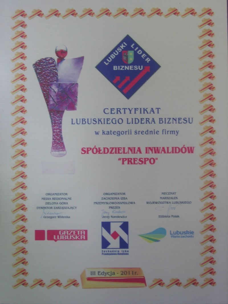 Potwierdzenie najwyższej jakości produktów oraz usług oferowanych przez PRESPO Spółka z o.o. stanowią certyfikaty i atesty nadane przez uznane w branży instytucje certyfikujące:
